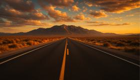 Leere lange Asphaltstraße, die sich in Richtung einer Bergkette erstreckt, goldene Stundenbeleuchtung, gelbe Straßenlinien, dramatische Wolken, Gefühl von Freiheit und Reise, Route 66-Atmosphäre.