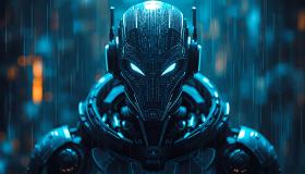 Bei dem Bild handelt es sich um eine KI-generierte Darstellung einer humanoiden Maschine. Das Bild zeigt einen Roboter in einer dunklen, futuristischen Umgebung mit blauem Licht. Es handelt sich um ein künstlerisches Motiv, das oft für Themen rund um künstliche Intelligenz verwendet wird. Die Maschine hat markante, leuchtend blaue Augen und eine detaillierte Rüstung.