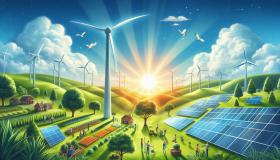 Das Bild zeigt eine Landschaft, die nachhaltige und umweltfreundliche Energieerzeugung darstellt. Es kombiniert verschiedene Arten erneuerbarer Energien und nachhaltiger Landwirtschaft. Windenergie: Mehrere Windkraftanlagen erzeugen Strom aus Windkraft. Solarenergie: Solarpanels, auch Photovoltaikanlagen genannt, wandeln Sonnenlicht in elektrische Energie um.